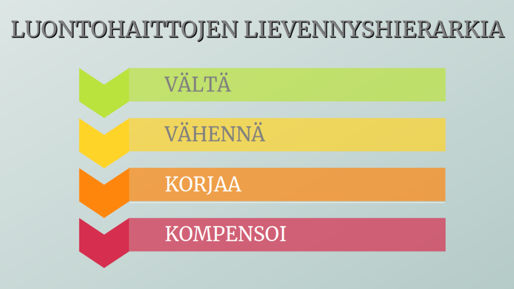 Luontopositiivinen rakentaminen pyrkii minimoimaan haitat luonnolle ja vahvistamaan luonnon monimuotoisuutta. Tätä ohjaa haittojen lievennyshierarkia: vältä, vähennä, korjaa ja kompensoi.